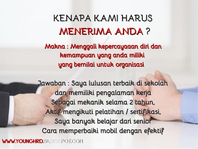 Itulah yang menyebabkan banyak orang menjawab "saya bisa menawarkan x kepada perusahaan". Tak sedikit pelamar yang jawabannya dianggap hrd kurang tepat, sehingga akhirnya tak diloloskan ke tahapan selanjutnya. Mar 13, 2020 · salah satu pertanyaan yang paling sering ditanyakan, bahkan menyiratkan jebakan, yaitu kenapa kita harus menerima anda?. Jan 18, 2021 · nah, sebelum jadwalnya tiba, kamu wajib menyiapkan berbagai jawaban dan alasan atas pertanyaan nanti, salah satunya adalah "mengapa perusahaan harus menerima anda?". Btw ini aslinya saya ditanyai "mengapa kami harus memberi beasiswa kepada anda?" untuk beasiswa jepang, saya tidak ditanyai pertanyaan ini.